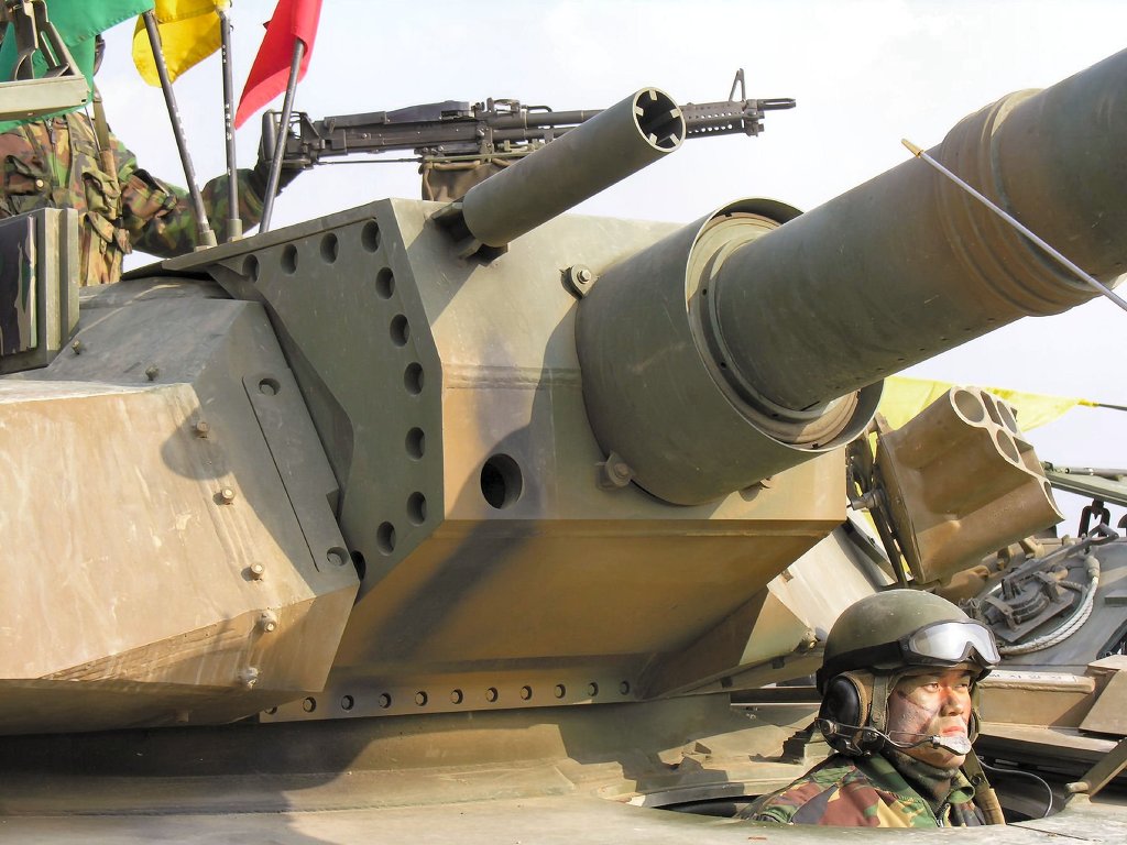 [K1A1전차의 주포는 미국제 M256 120mm 활강포로서 독일 라인메탈사의 Rh-120mm포를 라이센스하여 경량화시킨 타입을 장착하고 있다. 포구에는 거리를 측정하는 레이져 발사기와 포흔들림을 탑지하는 센서가 탑재되어 있어 정확한 조준을 돕는다]