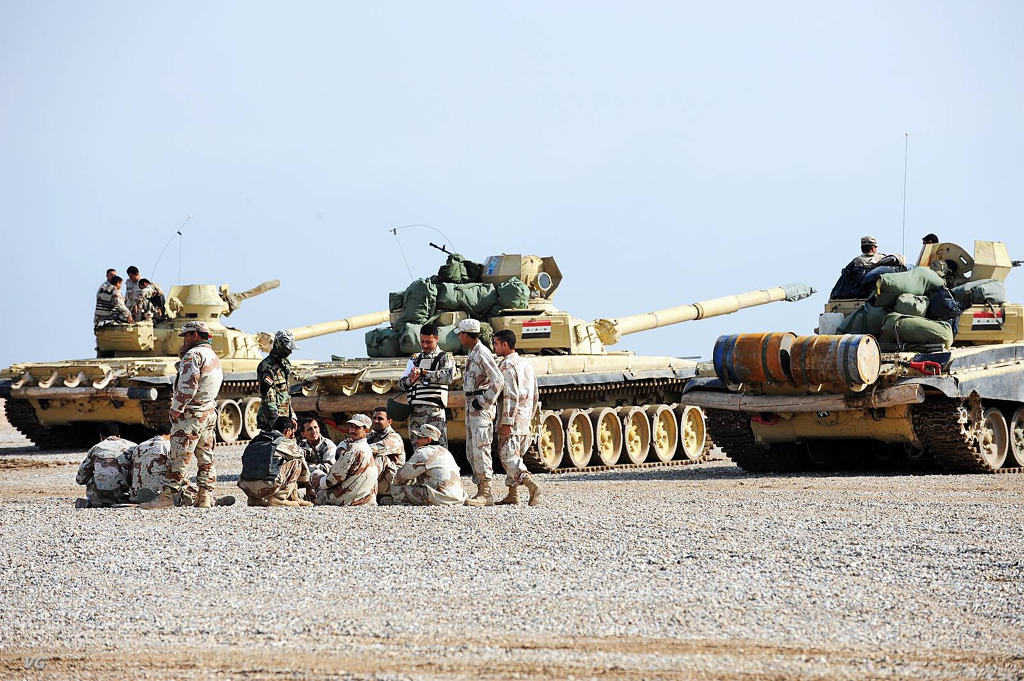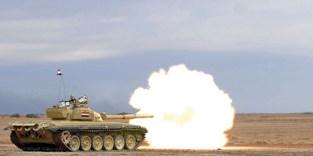 [이라크 전방작전기지 인근의 사격장에서 미육군과 합동 실사격 훈련을 실시하는 9사단 34여단 2대대소속 T-72 전차의 모습 신설 이라크군은 이것외에 미국제 M1A1 차량을 도입하여 운용하고 있기도 하다]