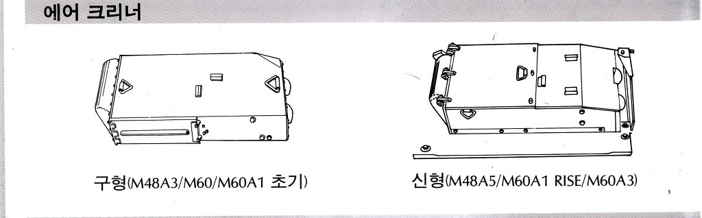 [M60A1 AOS(Add On Stabilizer) 에 오면 에어크리너도 대형으로 교체되는데 이는 구형 모델에 비해 오염된 환경하에서 더 오랫동안 작전하는것을 가능케 하였다.출처는 호비스트에서 1993년 출간된 그레이트 아머 씨리즈 NO3 M48/M60 PATTON 단행본에서]