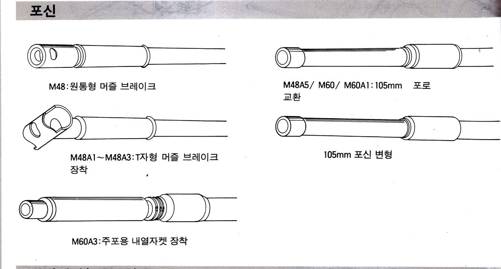 [M48~M60 씨리즈의 포신의 변화 를 나타낸 그림 출처는 호비스트에서 1993년 출간된 그레이트 아머 씨리즈 NO3 M48/M60 PATTON ]