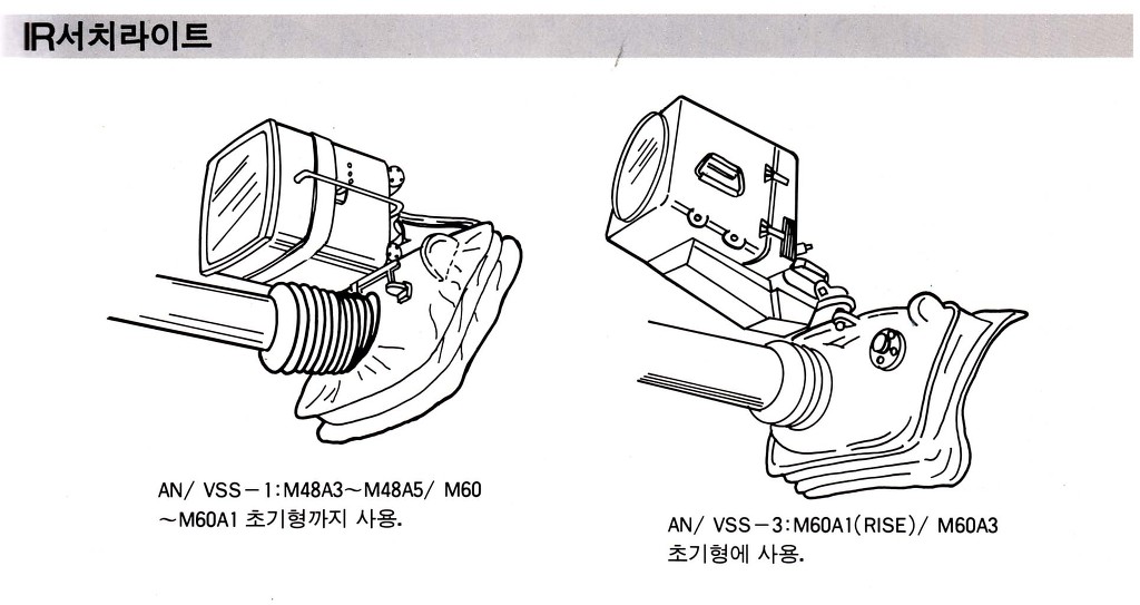 [M60A1(RISE/PASSIVE) 개량형에는 광폭증폭식 야시장비를 장비함과 동시에 혹시 모를 기계적 고장 (혹은 별빛마저 없는 깜깜한 전투에 대비하기 위해) 에 대비하기 위하여 기존의 IR 서치 라이트를 그대로 두는 경우가 많았다. 하지만 이처럼 3개의 고정고리만 있는 M60씨리즈는 보통 야시장비로 개량한 버젼이라 봐도 무관하다]