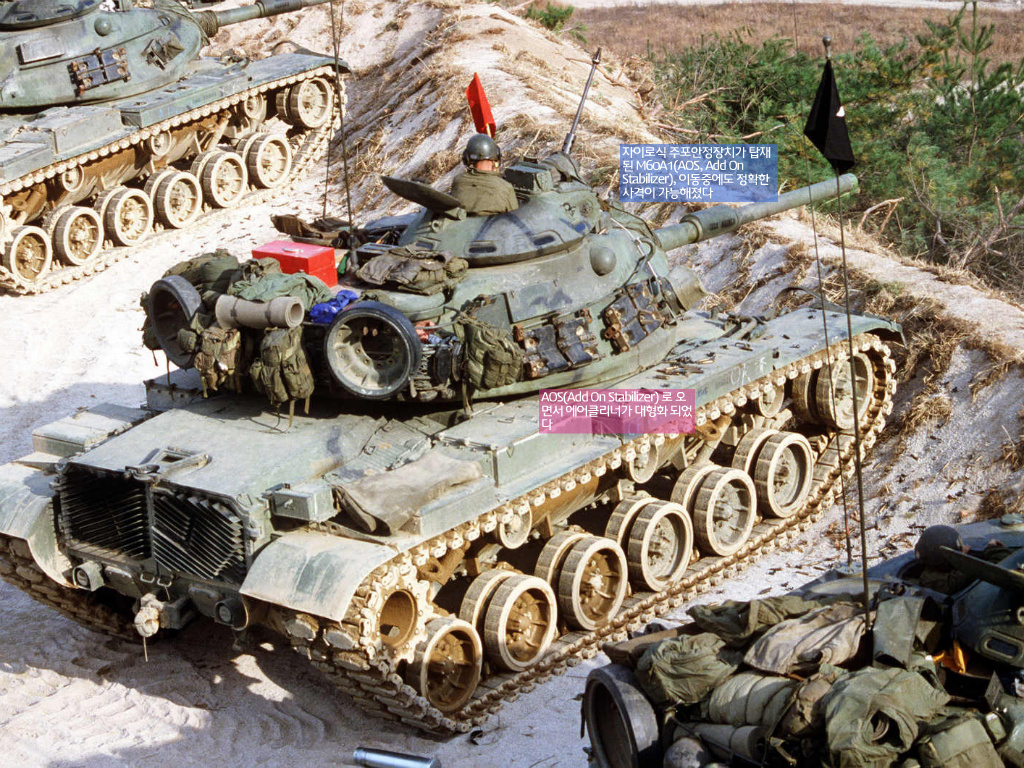 미군전차 최초로 AOS(Add On Stabilizer)장비가 도입된 전차로 기록된 M60A1형은 이제 이동중에도 완벽하게 정확한 사격이 가능하게 됨으로서 적전차에 비해 우세에 설수 있게 됩니다.