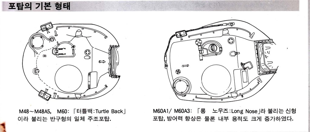 [ M60A1에 장착된 신형포탑인 롱노즈 타입과 M48과 M60초기형에 장착된 반구형 포탑의 외형차이를 나타낸 그림 출처는 호비스트에서 1993년 출간된 그레이트 아머 씨리즈 NO3 M48/M60 PATTON 단행본에서]