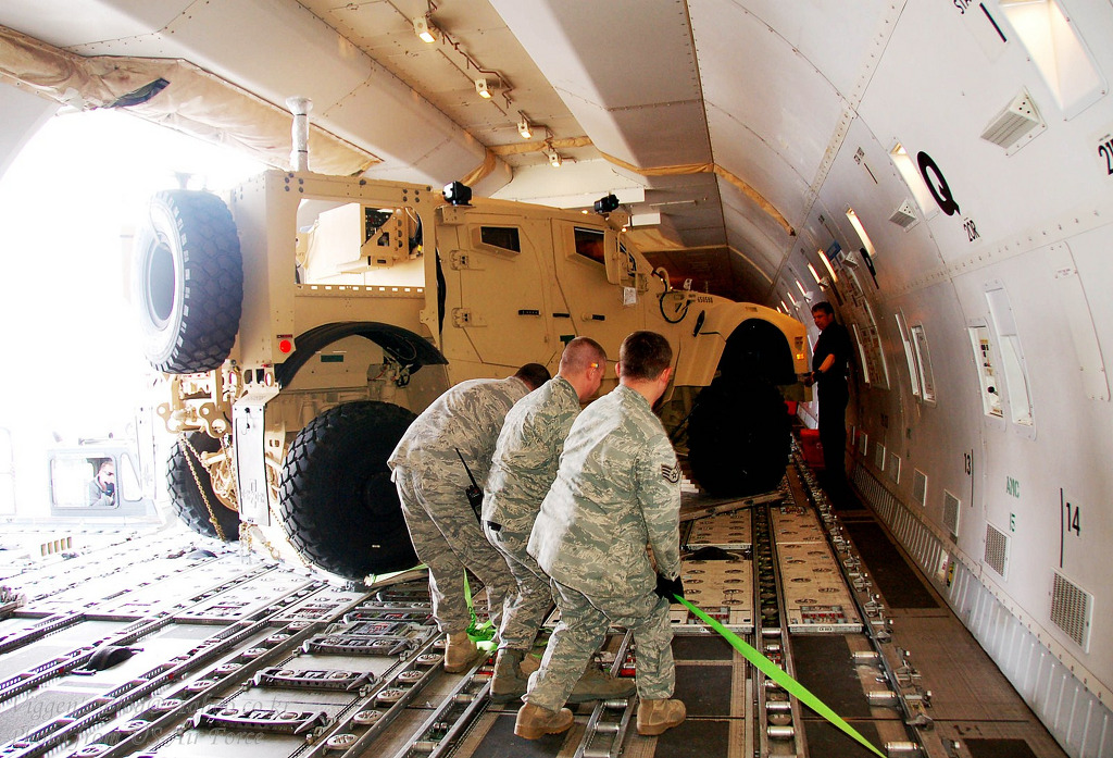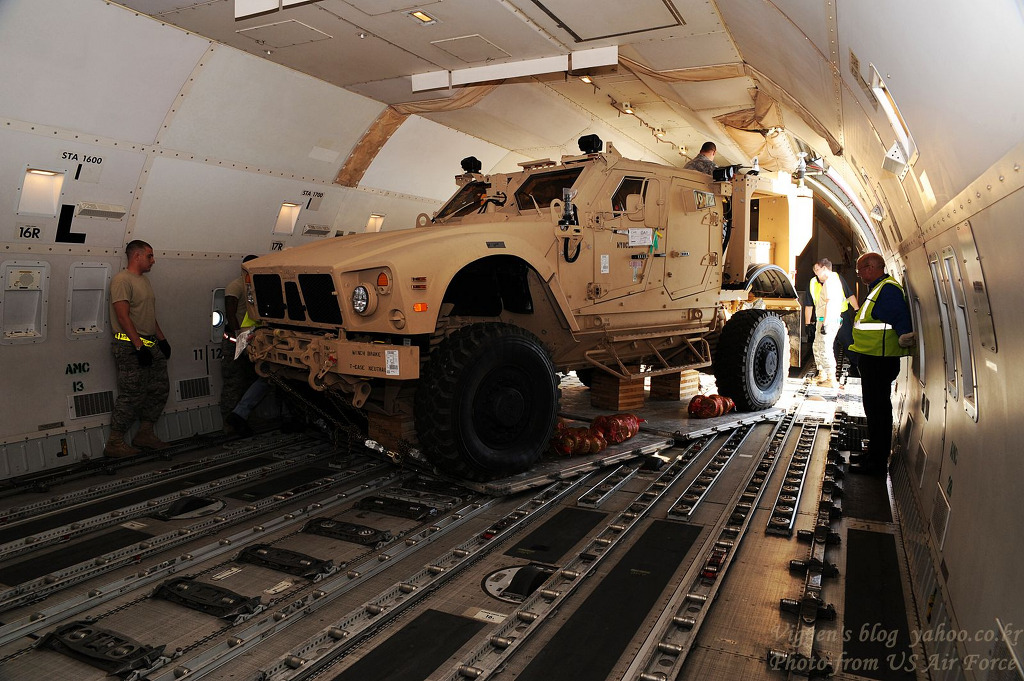 지난 9월 30일 미공군 Charleston기지에서 최신형 대지뢰장갑 전지형 주행 차량 (MRAP All-Terrain Vehicles, 혹은 M-ATV) 2대를 아프칸으로 공수하기 위해 McChord 공군기지의 C-17 Globemaster III 수송기에 적재하고 있습니다.