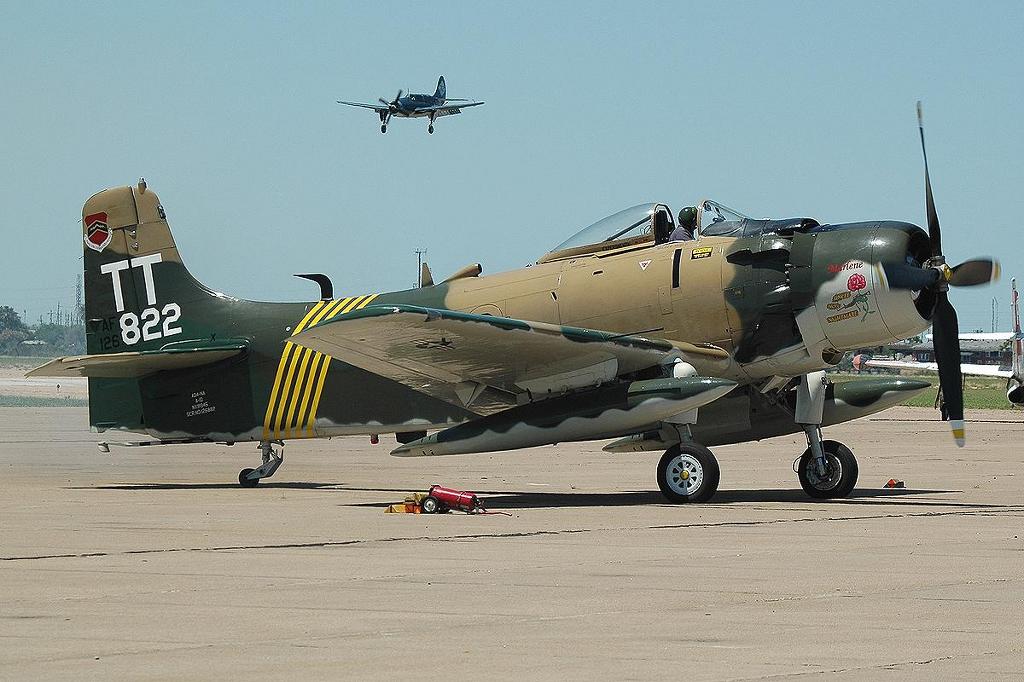 [스카이레이더는 베트남전에서 강력한 무탑재력과 뛰어난 비행성능, 웬만한 대공화기에는 격추되지 않는 강한 맷집으로 유명했는데 미해군을 비롯 미공군에서 도입해 사용하였고 특히 남베트남군에 많은 수가 공여되었다 사진은 네이팜탄을 장착하고 이륙준비중인 스카이레이더의 모습으로 복좌형 타입이다]