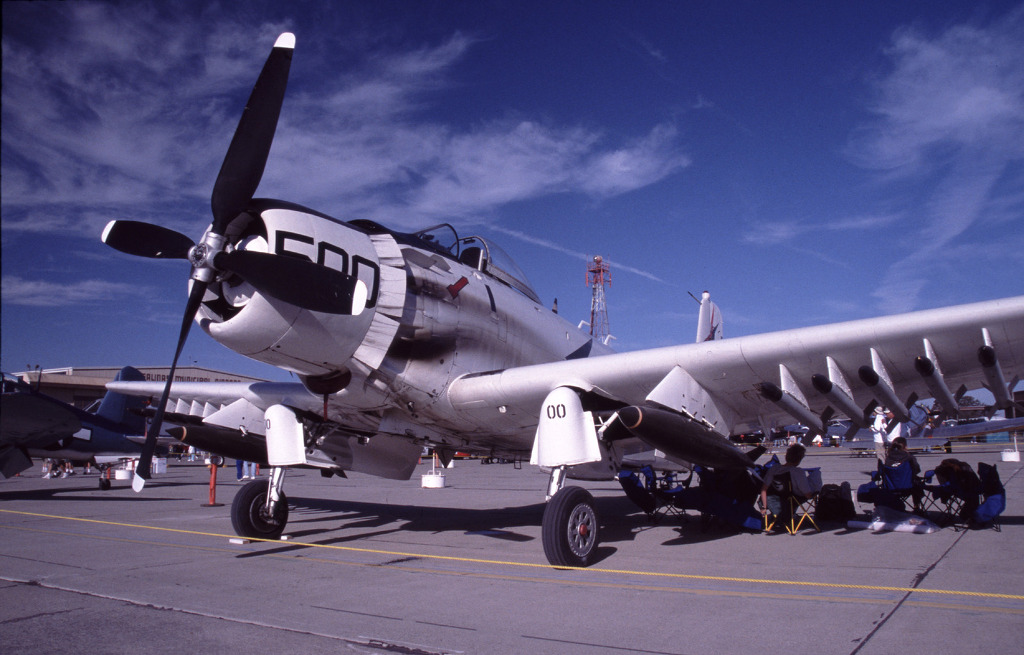 [다양한 무장을 하고 임시 가설된 격납고에 주기중인 스카이레이더의 모습 오래된 구식 레시프로 항공기라는 단점을 높은 신뢰성과 가동성 그리고 폭넓은 범용성으로 대체한 명 전투기로 한국전쟁과 베트남전에서 맹활약을 펼친 독특한 전투기이다]