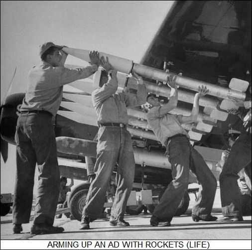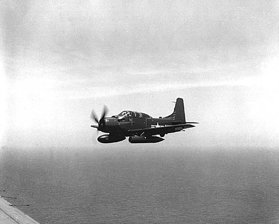 [통상폭탄을 장착하고 이륙준비중인 스카이레이더의 모습 무거운 폭탄을 장착하고도 주익을 쉽게 펴고 접을수 있는 튼튼한 구조를 잘 볼수 있다]