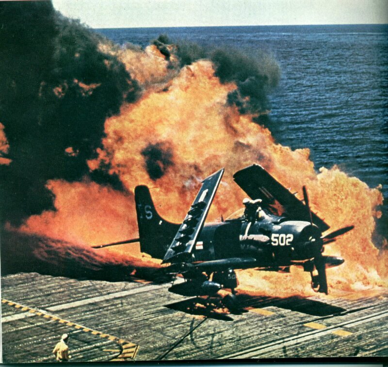 [이륙준비중 전기합선으로 발사된 로켓으로 아수라장이 된 갑판에서 탈출중인 스카이레이더 조종사의 모습 스카이레이더는 1940년대 개발되어진 오래된 구식 전투기지만 190년도 까지 무려 30년 가까이 쓰여진 레시프로 전투기 이다]