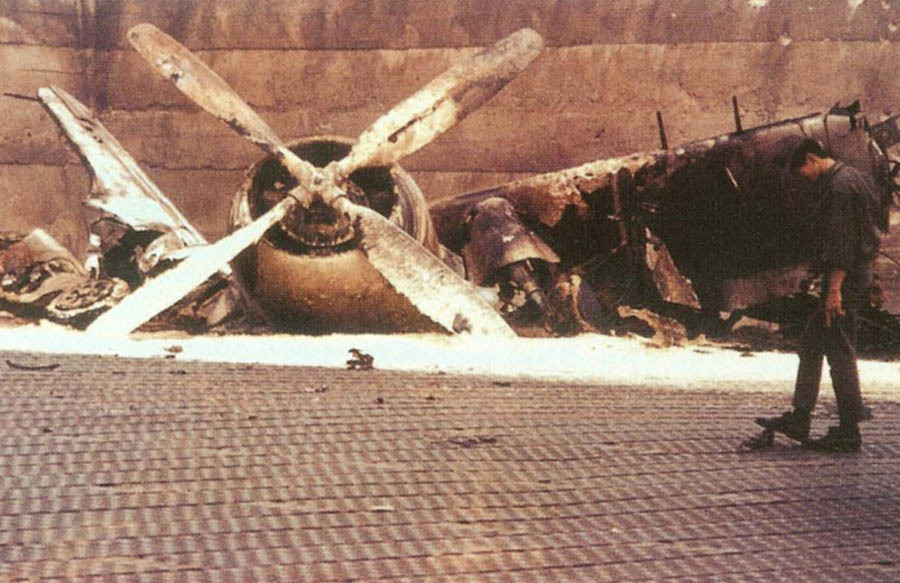 [1966년 6월 베트콩 박격포 공격으로 파괴된 플레이쿠 기지 제524 전투 비행대 A-1E 스카이레이더]
