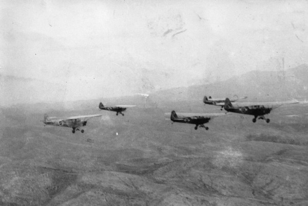 [한국전쟁 발발 당시 출격하고 있는 L-4 연락기 부대. 사진이 약간 희미하지만 동체 측면에 태극무늬가 그려져 있다. 미군에게 공여받은 뒤 미국 국적마크 위에 다시 태극그림을 덧칠하다 보니 우리 군과는 상관없던 줄무늬가 그대로 남아있다. 참고로 이 줄무늬는 최근에 태극기의 궤를 표현한 3줄 줄무늬로 변경되었다.]