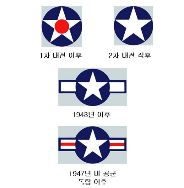 [미 공군의 국적 마크 변천사. 1947년 이후 현재 우리가 잘 알고 있는 빨간 줄이 추가된 줄무늬가 완성되었다.]