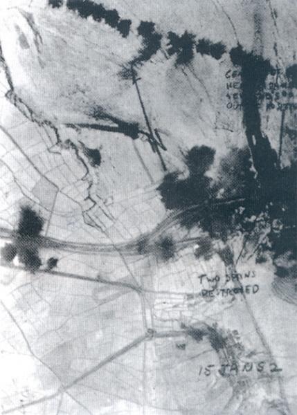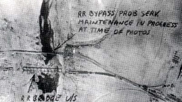[UN군 정찰기가 찍어온 승호리 철교의 모습. 아래쪽 철교는 이미 파괴되었으나 그 위에 새로운 철교가 들어섰다.]