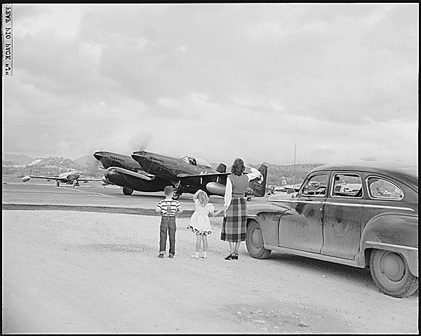 [일본의 한 기지에서 이륙준비 중인 F-82G. 탑승한 조종사들에게 가족이 손을 흔들고 있다(물론 연출된 사진으로, 저렇게 민간인이 기지 내에 함부로 들어오는 건 상상하기 어렵다). F-82G는 장거리 비행능력을 살려 일본기지에서 직접 이륙하여 한반도 상공을 초계하였다. 본래 야간전투용으로 개발된 전투기이지만 한국전 초반에는 주로 미군 수송기들에 대한 주간에 장거리 호위임무를 맡는데 쓰였다. F-82G 뒤편에 대기 중인 제트 전투기가 F-80 슈팅스타다.]