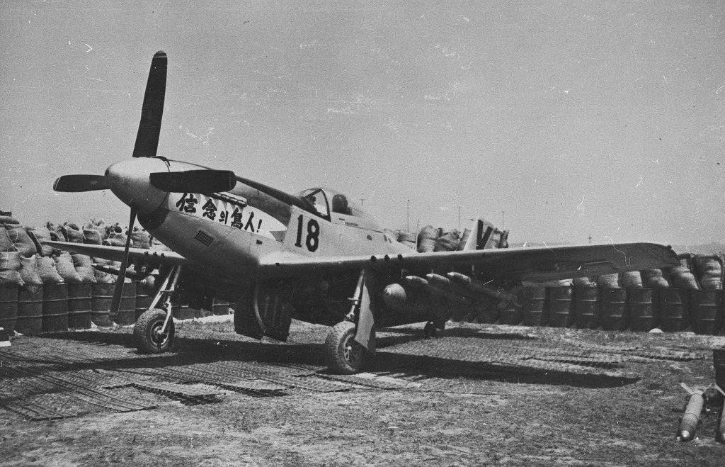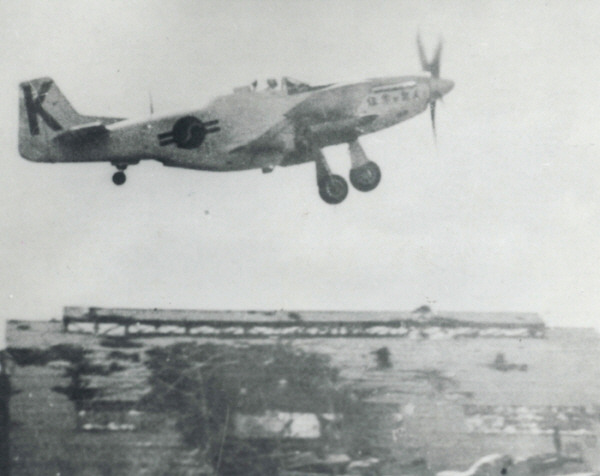 [이륙중인 F-51D. 기수에 신념의 조인이란 문구가 적혀 있는 것으로 보아 딘 헤스 소령 전용기인 듯하다(이 문구는 딘 헤스 소령의 기체에만 적혀있었다). 사진속의 F-51D 날개 밑에는 5인치 로켓과 500파운드 폭탄이 탑재되어 있다. 1951년 여의도에서 촬영된 사진. ]