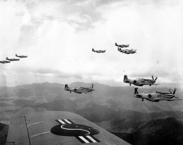[편대 비행중인 우리 공군의 F-51D 편대. 태극무늬와 함께 수직꼬리날게에 크게 쓰여 있는 K가 보인다.]