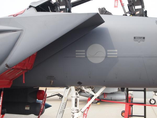 [F-15K 같은 전투기들은 회색 도색에 어울리도록 새로 그려진 국적 마크들은 이렇게 회색으로 되어있다.]