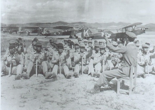 [우리 공군의 조종사들이 사천기지에서 지상교육을 받고 있다. 비록 전쟁 통에 열악한 환경 속에서 교육을 받고 있었으나 사기는 높았다고 한다. 뒤편에 보이는 항공기들은 L-4 연락기로 이 무렵에는 훈련용으로도 쓰였다. 휴전을 앞둔 1953년에 촬영된 사진.]