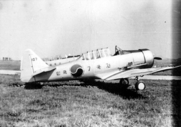 [우리 공군의 T-6 텍산. 미국이 전투기를 판매하거나 원조해주지 않으려 하자 우리 정부는 캐나다를 통해 훈련기이지만 약간의 무장탑재능력도 갖춘 이 항공기 10대를 도입하였다. 도입 당시 건국기라는 명칭을 부여하였으며, 각각의 기체에는 별도의 이름이 붙어 있다. 사진은 건국기 7호기인 국민호다(글씨 읽는 방향이 우에서 좌측). 초기도입당시에는 태극무늬 옆에 줄무늬가 없으나 이후 다른 우리공군 항공기들과 마찬가지로 줄무늬가 추가된다.]