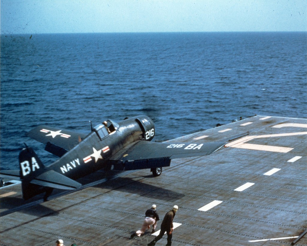 막배치되기 시작한 보우트사의 F4U 콜세어기는 앞서 배치되어 활약한 F6F 헬켓에 비해 대형기체이고 성능도 더 뛰어났습니다.