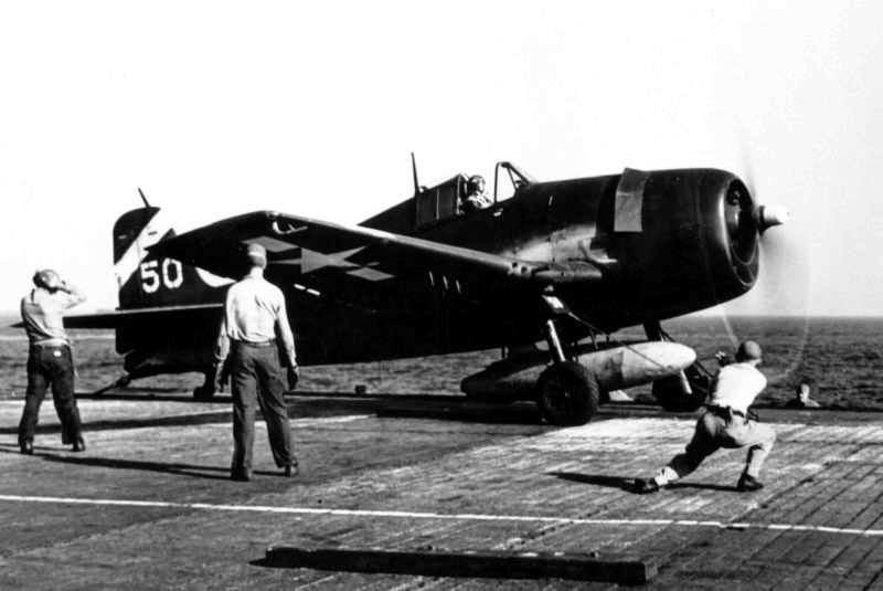 [항모에서 발진중인 F6F헬캣의 모습... 충분한 엔진추력덕에 풀무장과 연료를 만재하고도 이처럼 항모에서 이륙이 가능했다]