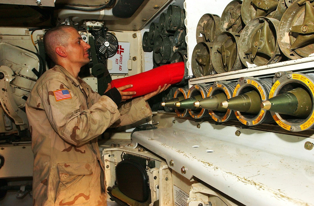 [측면에는 포탄적재함이 있다. 장약 (빨간색) 과 포탄 그리고 신관은 서로 별도 관리되며 발사시 조립 세팅하여 발사한다 사진에서 볼수있듯 자주포내의 포탄적재수는 매우 적으며 이를 위해 반드시 포탄을 싣고 움직이는 탄약수송차가 현대 자주포의 필수 장비이다]