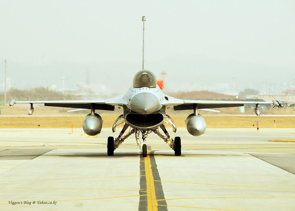 [이륙을 위해 택싱웨이를 할주중인 KF-16C 형의 모습 이는 도입 당시 최신의 블록 52형을 기반으로 한국사양에 맞게 개량된 타입이다. 당시로는 최강의 전투기 사양중 하나였지만 나중에 도입된 F-15K 에 비해서는 경량전투기의 한계를 보여주는 기체이기도 했다 마치 2000cc자동차와 4000cc 급 대형차와 비슷한 경우라 하겠다