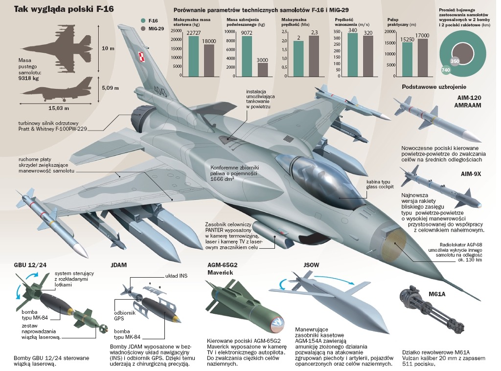 무장 : M61A1 발칸 20mm 기관포 1문, AIM-9 사인드와인더, AIM-120 암람, AGM-65 매버릭, AGM-45 슈라이크, AGM-88 HARM(와일드 위즐, KF-16), AGM-84 하푼(KF-16, 이집트 공군용 F-16), 기타 폭탄 등