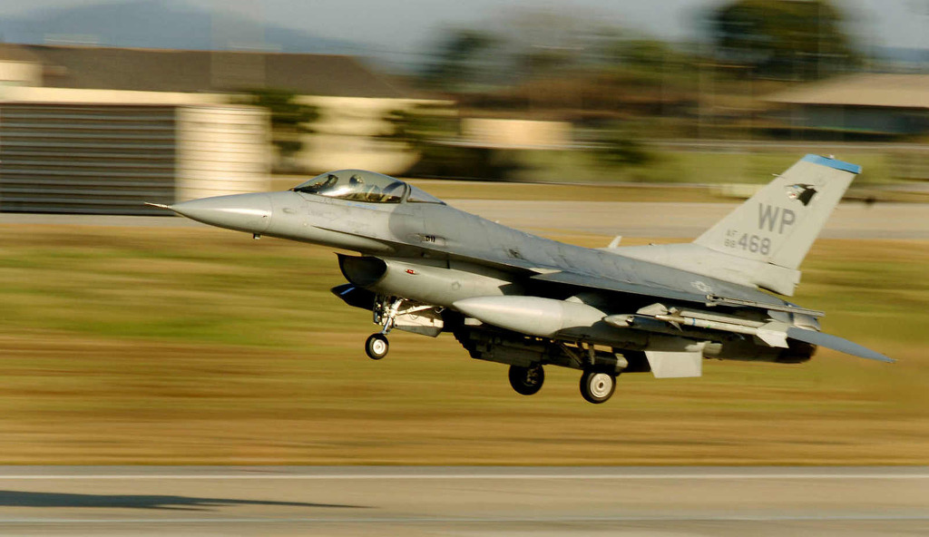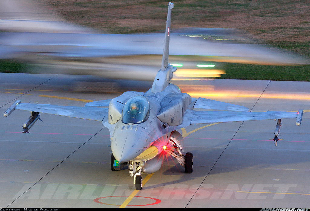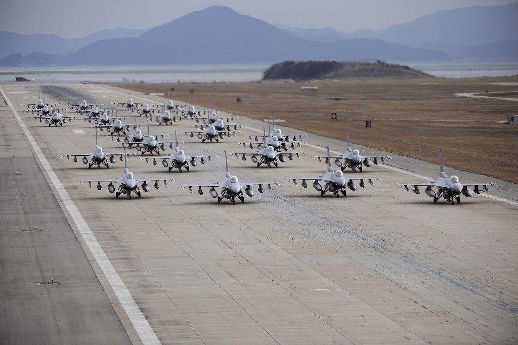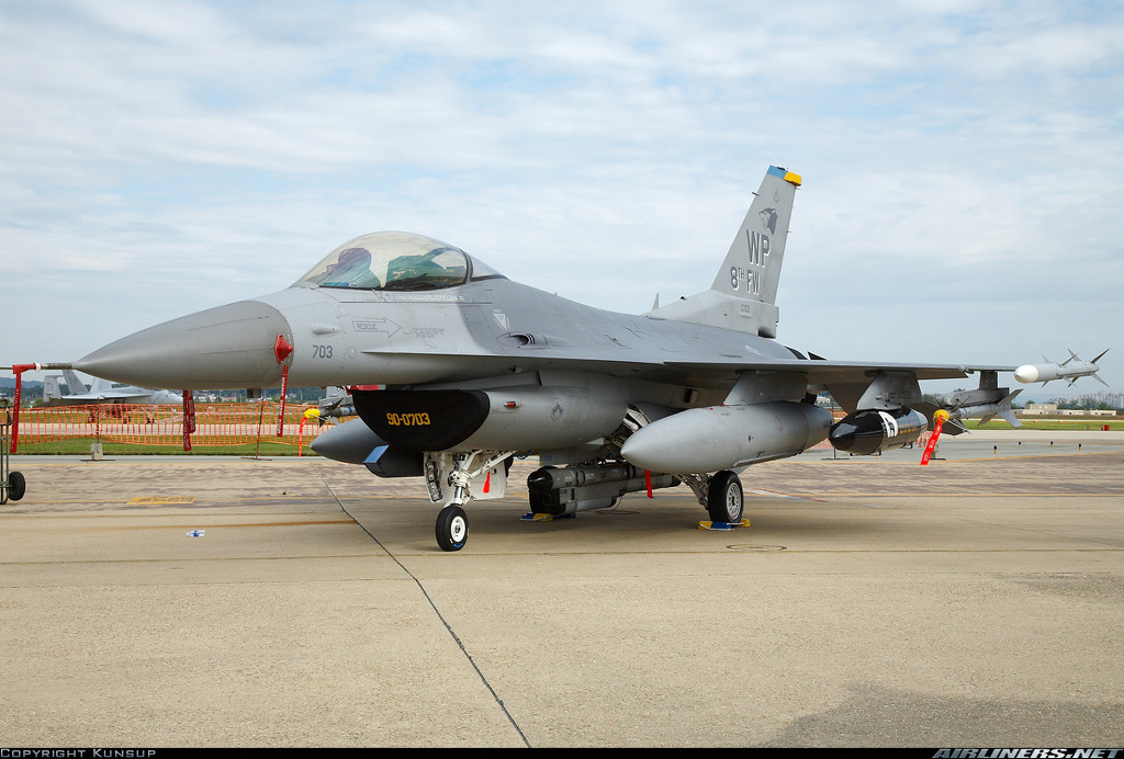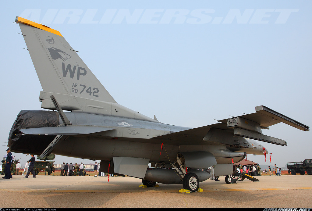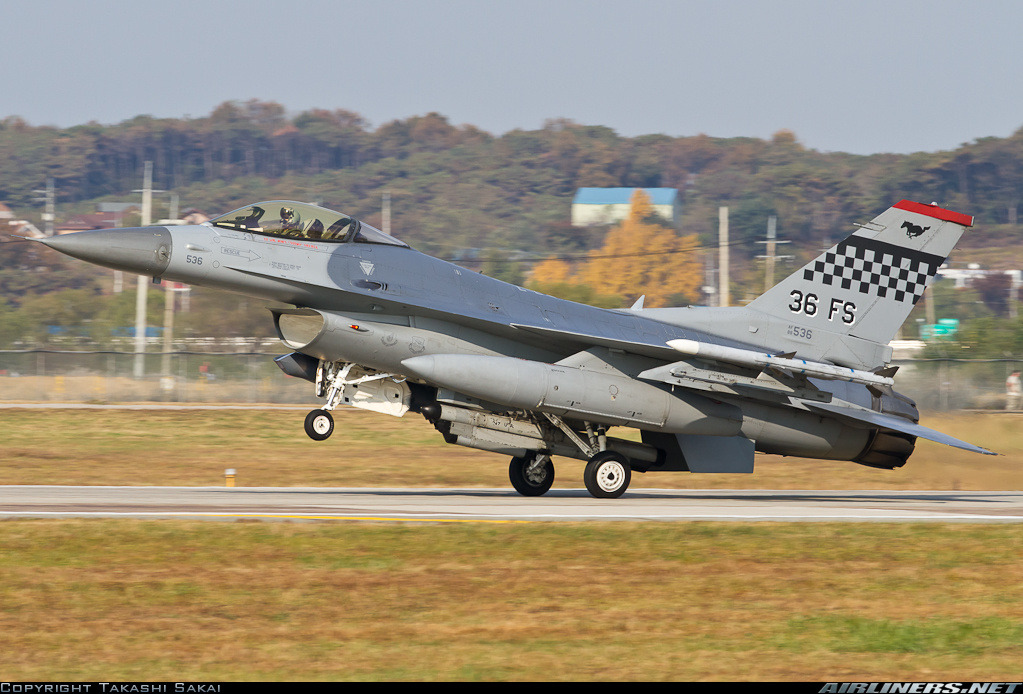 [이륙을 위해 택싱웨이를 할주중인 KF-16C 형의 모습 이는 도입 당시 최신의 블록 52형을 기반으로 한국사양에 맞게 개량된 타입이다. 당시로는 최강의 전투기 사양중 하나였지만 나중에 도입된 F-15K 에 비해서는 경량전투기의 한계를 보여주는 기체이기도 했다 마치 2000cc자동차와 4000cc 급 대형차와 비슷한 경우라 하겠다]