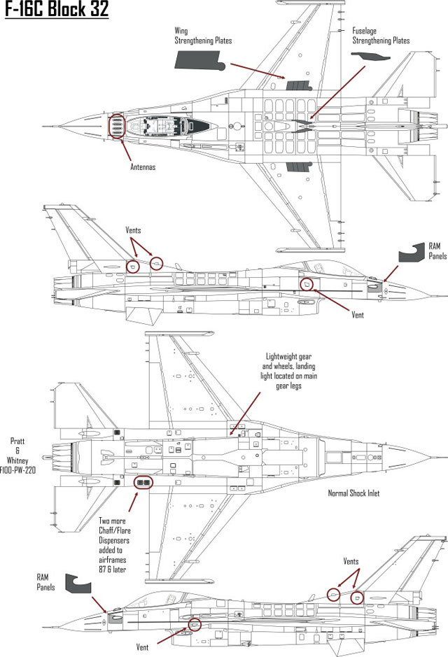 [7] GE엔진이 추력도 더 크고 공기도 더 많이 먹는 관계로 GE엔진을 단 F-16들은 공기흡입구가 좀 더 넓다.