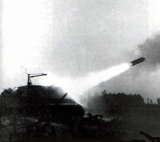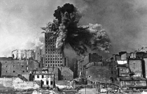 [스툼티거의 로켓으로 파괴되는 건물의 모습.. 구경이 구경이고 무게가 370킬로나 되는 지라 일단 맞기만 하면 단단한 건물은 물론이고.. 콘크리트로 포장된 요새도 파괴가 가능했지만 탄도가 곡선에다가 포구속도가 늦어 사용에는 어려움이 많았다]