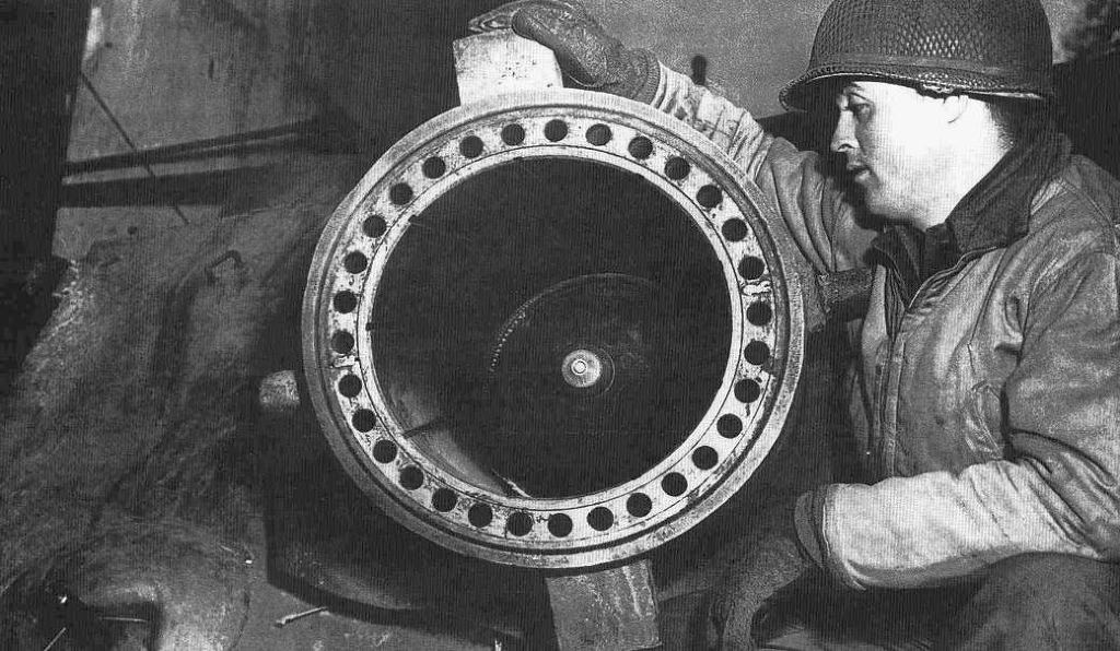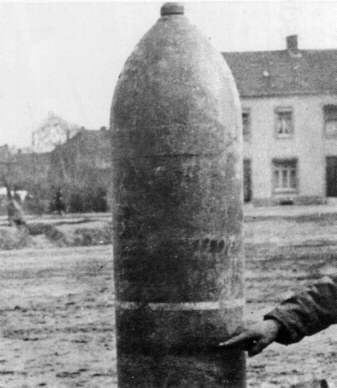 [포구에 장착된 모습을 살펴보는 미군의 모습.. 380밀리 이 포탄은 원래 해군용 대잠로켓 발사기였으나 독일육군은 이를 대량으로 사용해 시가전에 이용했다 (심지어 간단한 나무발사기에 장착한 타입도 있었고 이를 여러발 장착한 원시형태의 다연발 로켓형태도 존재했다)]