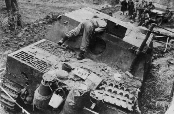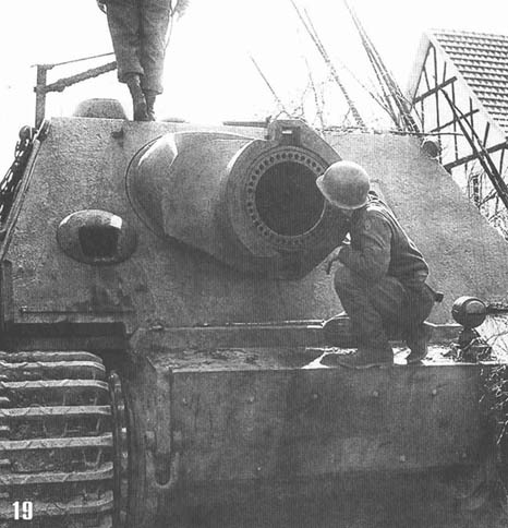 [수툼티거는 일단 맞기만 한다면 당시 어떤전차도 확실하게 날려버릴수 있는 강력한 한방을 가진 전차였으나 한발 발사후 재장전을 위해 승무원이 밖으로 나와야 하고 또 무거운 전차라 운동성이 떨어져 본격적인 대전차 임무로 사용하기는 무리였다 사진은 노획된 스툼티거를 살펴보는 미군의 모습으로 380밀리 로켓포의 탄피를 살펴보는 모습이다]