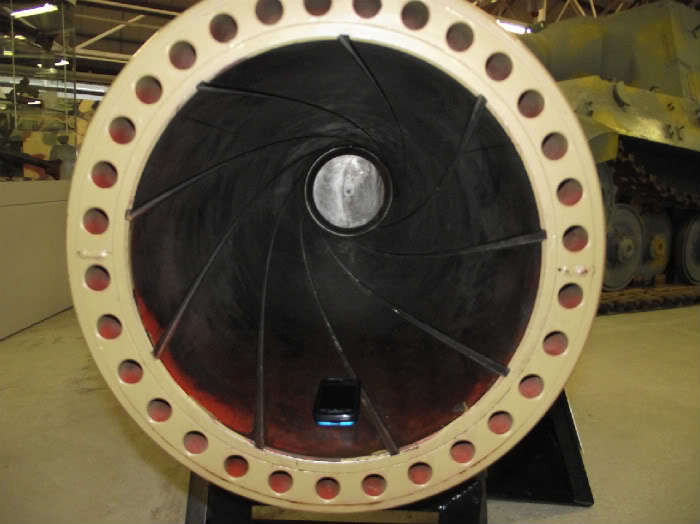 [포구의 모습 구경이 5.4 구경으로 비교적 짧아 사거리가 고작 몇백미터에 불과하다는게 문제였지만 일단 맞기만 하면 당시 어떤 연합군 전차로 한방에 보낼수 있었고 (심지어 근처에 떨어진 포탄으로 미군전차 3대가 KO된적도 있다) 콘크리트나 벽돌로 된 토치카가 주택을 파괴하는데 이만한 무기가 없었다. 포신에는 명중률을 높이기 위한 강선이 파여져있다]