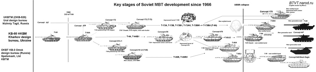 [전후 구소련전차의 개발사상을 한눈에 보여주는 표 T-64는 기존의 T-54/55/62와는 혈통자체가 전혀다른 전차로 개발되어진 하미믹스급 전차였다]