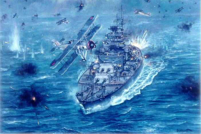 [비스마르크호를 끝장내게 한 주인공은 다름아닌 2차대전 개전당시에도 이미 고물비행기라 놀림을 받던 소드피쉬라는 복엽기였다. 이는 속도도 느리고 당시에도 이미 고물취급받던 복엽기타입의 뇌격기였지만 우수한 성능과 뛰어난 조종사덕분에 비스마르크호를 추격 어뢰로 조타장치를 명중시켜 비스마르크호가 더이상 도망치지 못하게 하였고 결국 이들 소드피쉬들의 집요한 공격덕에 비스마르크호는 꼬리를 잡혀 격침되게 된다]