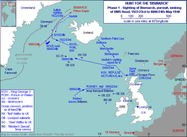 [후드 격침이후 동료함 프린스 오브 웨일즈도 반격, 발사한 포탄이 비스마르크호의 선수부분에 명중 비스마르크 역시 상처를 입고 서로 퇴각하였으며 후드이 격침을 보고받은 영국은 즉각 추격팀을 소집 비스마르크호를 추격하기에 이른다. 덴마크해엽전투에서 후드를 격침하고 자신도 상처를 입은 비스마르크호는 선수를 아군지역인 프랑스로 향했고 이어 영국해군은 포위망을 좁혀오면서 추격했으나 이를 놓치게 된다. 하지만 비스마르크호에서 보낸 무전을 방수한 영국해군은 비스마르크호의 위치를 파악했으며 이어 구식항공모함 로열아크호에서 출격한 소드피쉬들에 의해 비스마르크호를 발견 방향타에 심각한 타격을 입히게 되었다]