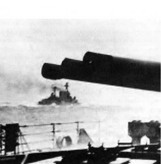 [비스마르크호의 일제포격모습 15인치 (380밀리) 주포 8문이 뿜어내는 포격은 어느 함선이라도 맞기면 하면 일격에 나가떨어질 정도로 위력적이였으며 특히 성능이 우수한 독일제 거리측정기 와 조준기의 장착, 그리고 훈련이 잘된 정예병들로 인해 초탄만으로 명중이 가능할 정도로 비스마르크호의 실력은 우수했다 다만 운이 없었을뿐..]