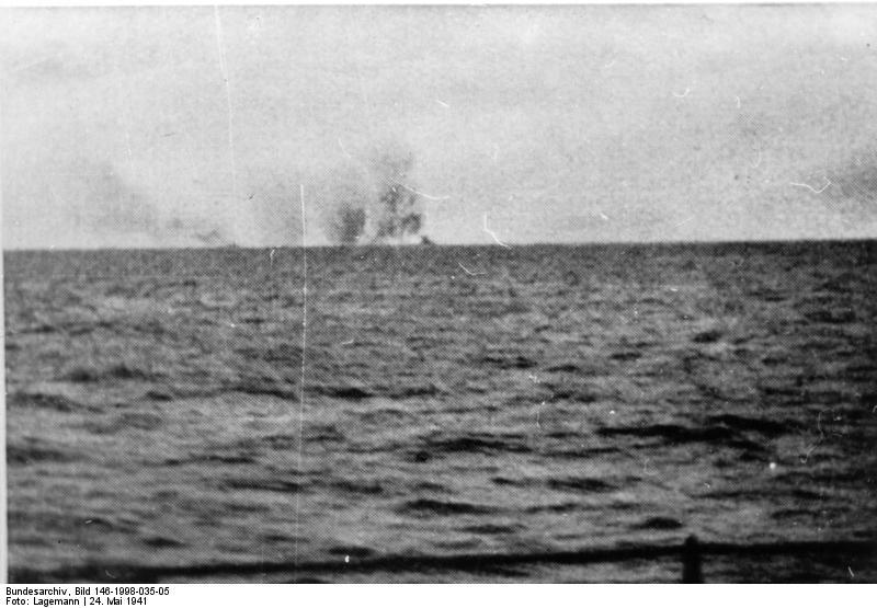[비스마르크호의 함포를 맞고 침몰하는 후드호의 모습 애석하게도 공격은 후드호가 먼저 했으나 프린츠 오이겐을 비스마르크호로 착각하고 사격했으며 그나저 빗맞았다 바로 응수를 한 비스마르크호의 380밀리 주포가 후드의 탄약고에 명중 탄약이 유폭되며 바로 수장되었다. 이 피해로 후드호에서는 단 3명을 제외하고 모두 사망!]