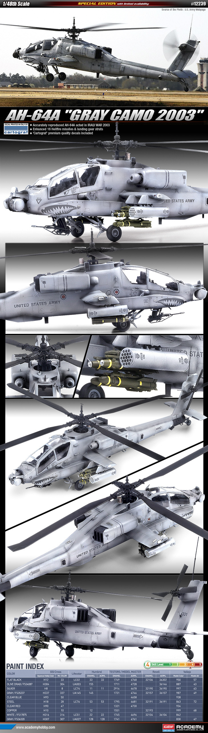 어제 아카데미 홈페이지에 가보니 난데없이 #12239번 1/48 AH-64A GREY CAMO IRAQ 2003 버젼의 공지가 떴더군요.. 원래 11월에나 나올 제품인데... 그래서 부랴부랴 준비했습니다.