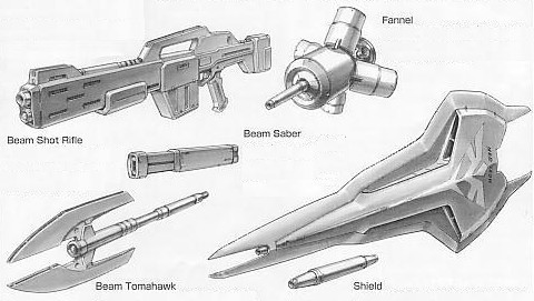 예비용 빔 사벨 X 2 - 팔 안쪽에 장비 빔 토마호크 사벨 - 방패 뒤에 장비 빔 샷 라이플 확산 메가 입자포 - 복부에 장비 판넬X6 - 등 뒤의 판넬 스탠드에 장비 방패 With 미사일 |