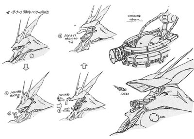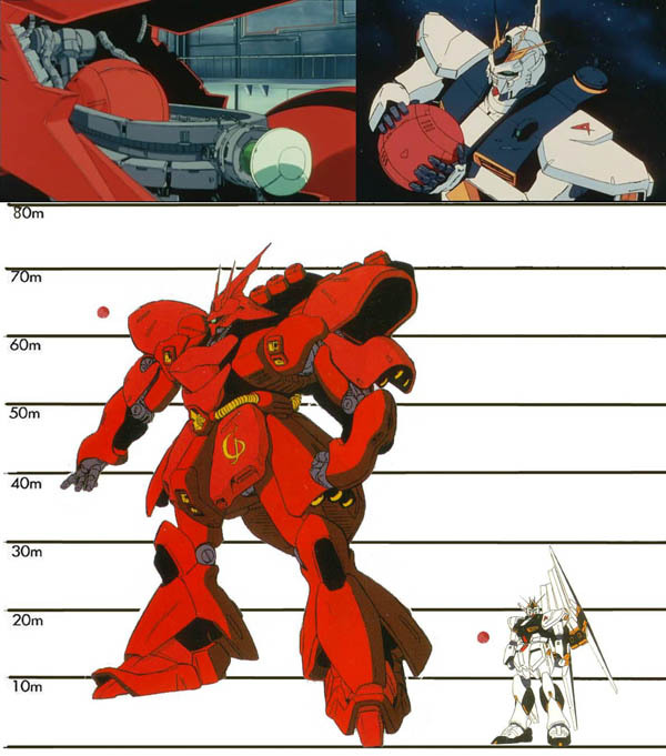 사족으로 사자비용 탈출 포트를 디자인한 디자이너는 가슴에 집어넣을 생각으로 디자인했지만, 토미노 감독이 머리에 집어넣어야한다고 하는 바람에 실측비례가 엉망이다. 사자비에게는 모노아이보다 약간 큰 정도의 콕피트가 뉴 건담에게는 머리통 크기. 원작의 탈출포트 크기를 기준으로 삼는다면, 사자비의 전장은 70M에 육박한다.