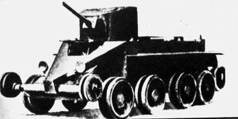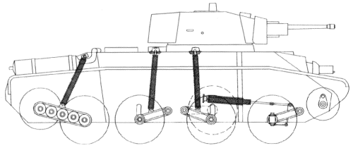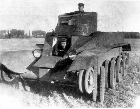 [BT 전차는 크리스티나 전차와 마찬가지로 도로상에서는 궤도를 벗겨내고 이처럼 차륜으로 달릴수 있었는데 이점을 높이산것은 소련군부의 높으신 어른들이였나 실제로 도로가 잘 발달하지않았던 소련의 영토내에서는 그다지 큰효용이 없어 후속전차인 T-34에서는 페지되었다]