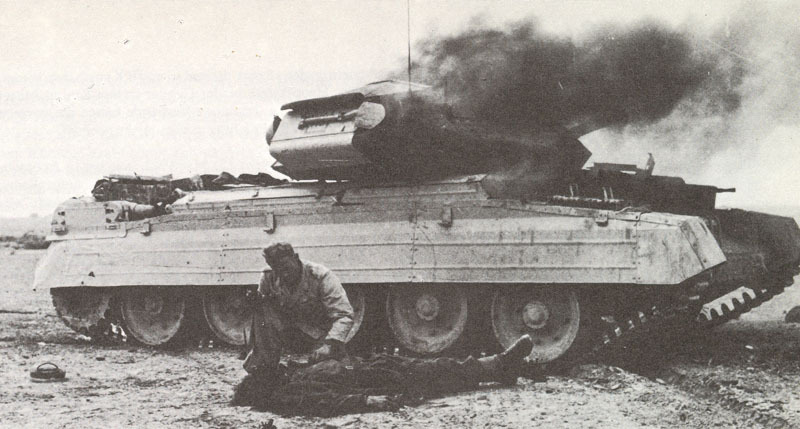 [크루세이더 전차를 앞선 전차들보다는 나은편이였으나 역시 방어력이 떨어져 독일군 전차에게 타켓역활밖에 할수 없었다 전사한 전차승무원을 위해 기도하는 군목의 모습으로 이미 파편으로 목이 달아난 뒤이다. 뒤에는 피격되어 불타는 크루세이더 전차의 모습]