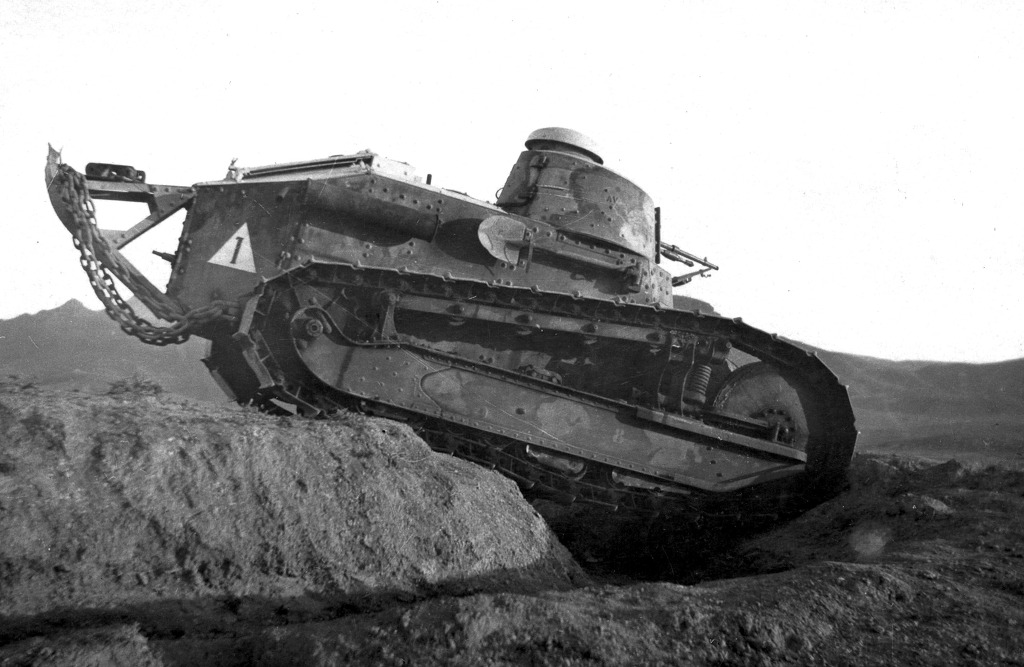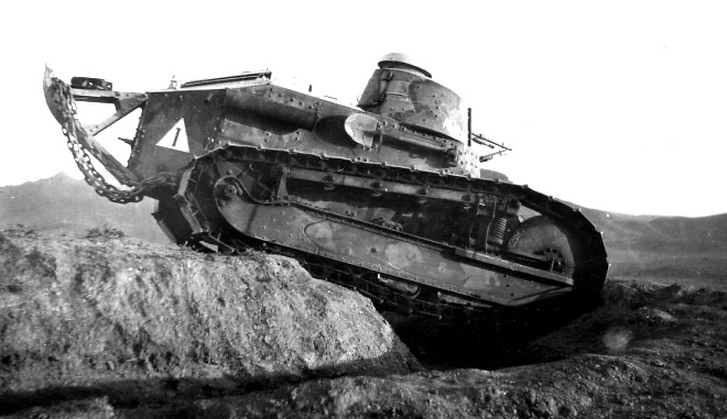 [참호 돌파모습을 보여주고 있는 프랑스군의 FT-17 전차의 모습 참호는 1차대전에 등장한 이래 지루한 전쟁을 이어가는 주된 방어무기중 하나로 수백킬로나 이어지는 참호와 기관총과 지뢰로 방호되는 참호로 인해 전쟁의 양상은 지루한 대치전으로 갈수밖에 없었고 이를 타개하기 위한 신무기중 하나가 바로 전차와 비행기의 개발이였다]