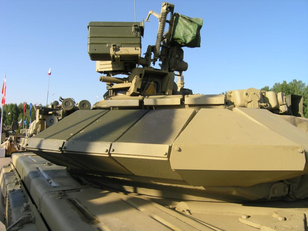 T-90A의 포탑, 주조 장갑이 아니라 용접 장갑을 사용했기 때문에 러시아제 전차 특유의 반구형 포탑이 아니라 서방제 전차들처럼 각진 형태의 포탑이다. 다만 전면에 콘탁트-5 반응 장갑이 장착되고 측면과 후면에 붙여놓은 공구 박스들로 인해 실제로는 아직도 둥글둥글한 모습이다.