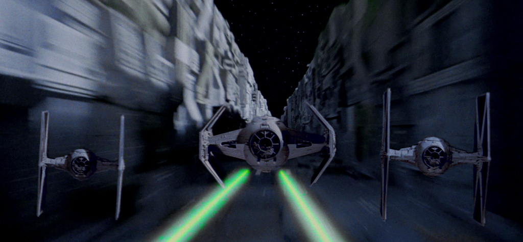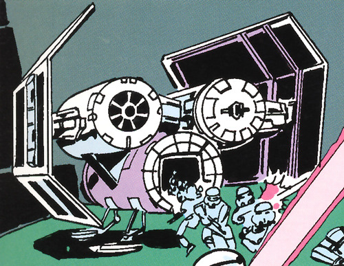 한 솔로가 갑자기 나타나 호위기 중 하나를 격추하자, 순간 균형을 잃은 나머지 호위기 1개가 데스스타와 충돌하여 그 영향으로 데스스타 밖으로 튕겨져 나갔다. 이런 사고에도 불구하고 기체 자체에는 이상이 없었으며, 오히려 이 사고 덕분에 데스스타가 폭발할 때 위험범위에서 벗어날 수 있었다. 그래서 다스 베이더만 유일하게 탈출하여 도망칠 수 있었던 것이다.