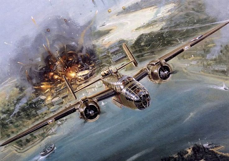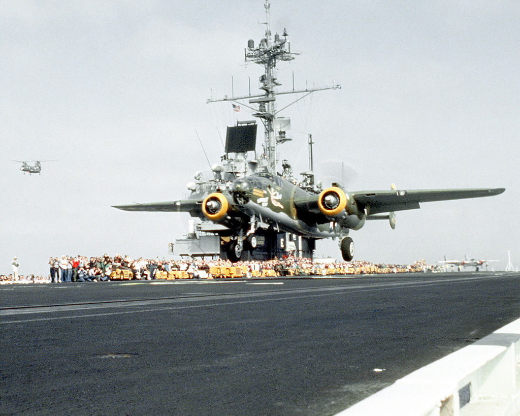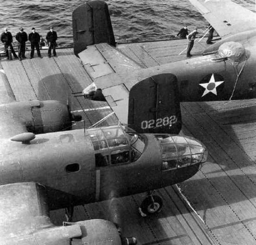 [출격중인 USS Hornet (CV-8) 에 16대의 B-25B 폭격기들 1942년 4월1일 당시 최신의 항공모함인 USS Hornet (CV-8) 에 16대의 B-25B 폭격기들이 갑판에 실려졌다. 거대한 크기 때문에 항공기는 갑판에 가지런히 실려졌으며 파도의 흔들림에 바다로 떨어지는것을 막기위해 단단히 묶여 있었다.]