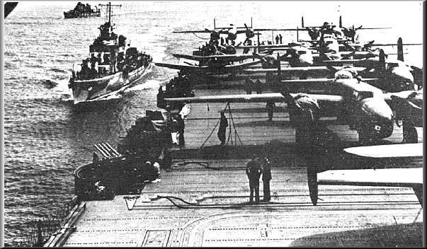 | 항공모함 호넷의 비행갑판을 뒤덮은 폭격기들 |