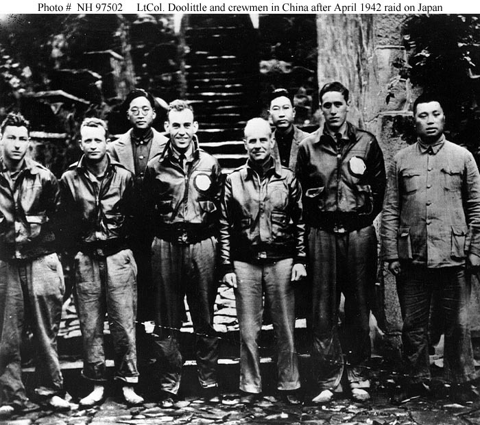 해당 제안의 경우 사실상 목표에 육탄돌입만 안했지 카미카제나 다름이 없는 제안이었다. 일단 육상기지용 폭격기는 활주거리가 길기 때문에 항공모함에서 이함시키는 것이 극히 곤란했고, 덤으로 착륙거리는 더 길기 때문에 사실상 착함은 불가능했다. 즉 한번 이함하면 다시는 돌아올 수 없다는 것. 하지만 이를 자원한 조종사들이 실제로 있었다. 앞줄 왼쪽부터 제임스 H 둘리틀 소령(조종수), 리차드 E 콜 중위(부조종수), 뒷줄 왼쪽부터 헨리 A포터중위 (항법사) |