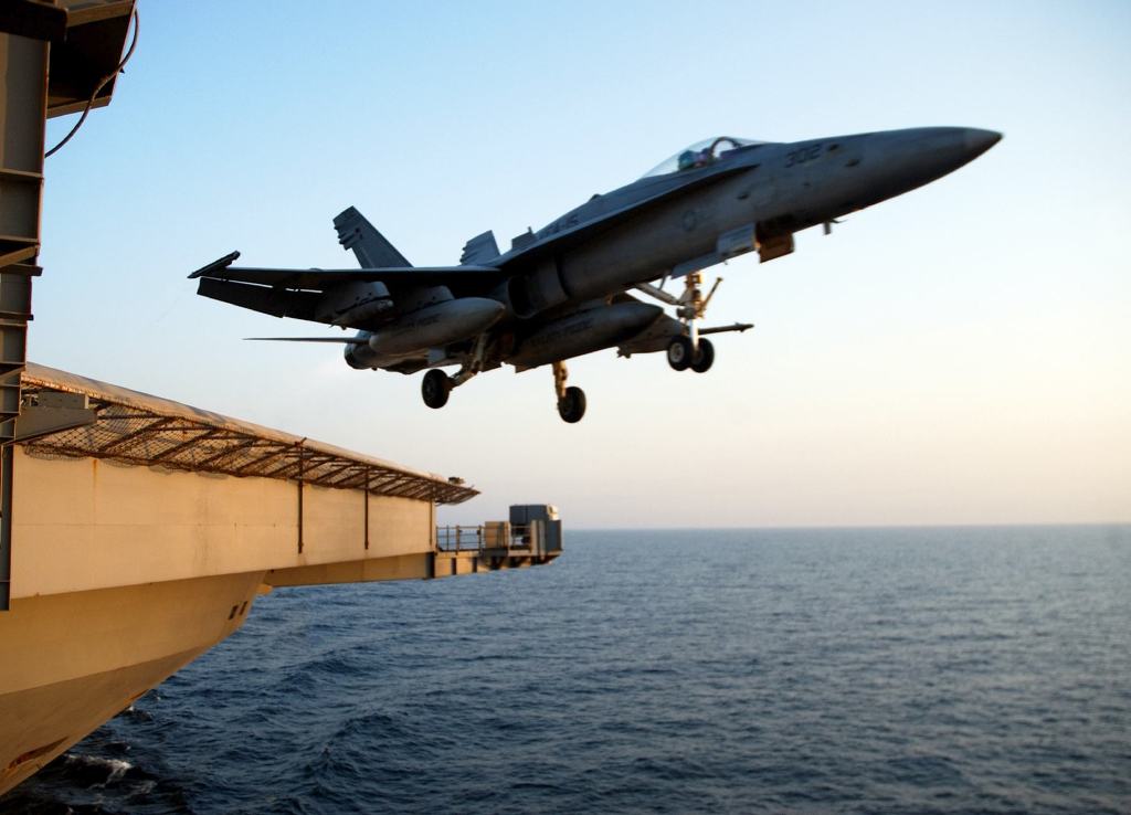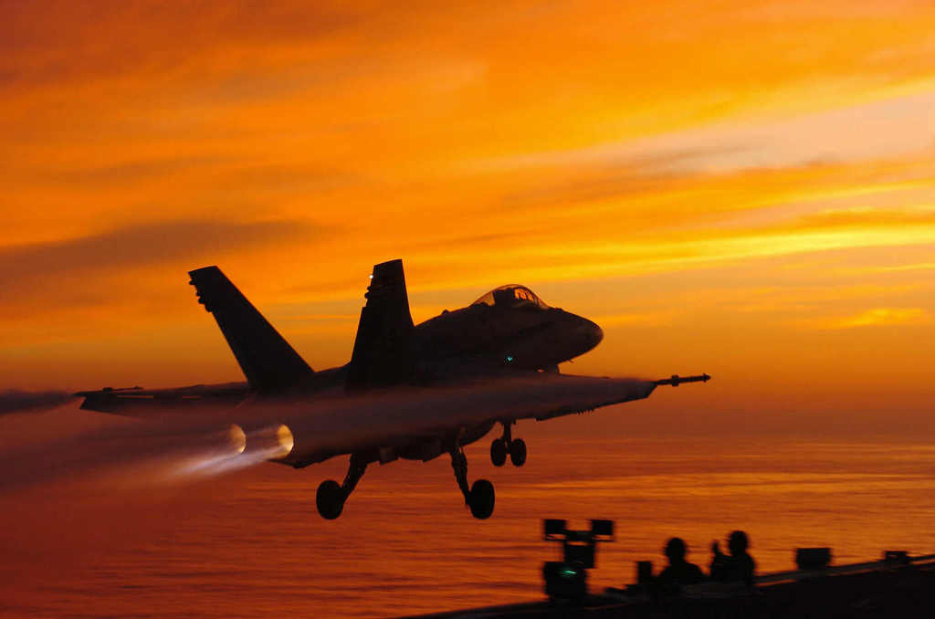 [착륙중인 호넷... 호넷은 경전투기로 개발되었으나 뛰어난 설계로 인한 고성능 기체로 현재 미해군 & 해병대의 주력 기체로 사용중이다]